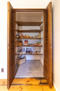 無垢扉の造作キッチンは、料理が楽しくなるデザイン。横のパントリーやカウンター収納で使い勝手も抜群です。家事動線を意識したレイアウトで、日常の暮らしがスムーズになります。