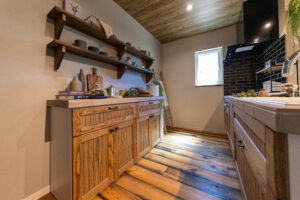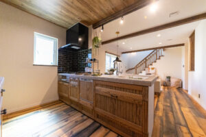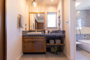 アンティコの家は、素材やデザインの一つひとつにこだわりが詰まっています。例えば、キッチンはパインやナラの無垢材の扉にペイントを施し、毎日の料理が自然と楽しくなる工夫がされています。バニティは木製カウンターとタイルで仕上げられ、世界にひとつだけの特別な洗面台を実現しました。