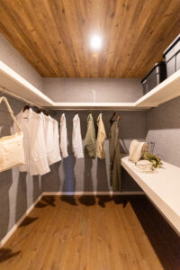 天井の木目や壁の落ち着いたトーンが、収納空間でありながら心地よさを演出。すっきり片付いた暮らしを叶えながら、毎日のコーディネートも楽しくなります。