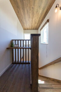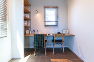 2階ホールのフリースペースには造作棚と机を設置。遊び場や学習スペースとして活用でき、子ども部屋の延長としても便利です。家族の成長やライフスタイルに合わせて自由に使えるのが嬉しいポイント。