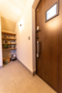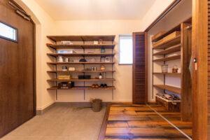 玄関は、家に入った瞬間にほっとするぬくもり空間。無垢材の床と塗り壁がやさしい印象をつくり、可動棚やクローゼットで収納力も抜群です。土間スペースも広めで、ベビーカーやアウトドア用品もすっきり片付きます。