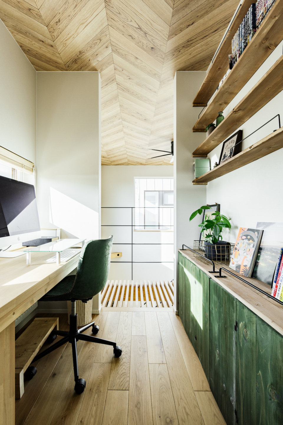 また、ワークスペースの近くに棚や引き出しをつくっておくと、書類や文房具が散らかりにくくなります。仕事と暮らしを両立するための小さな工夫です。