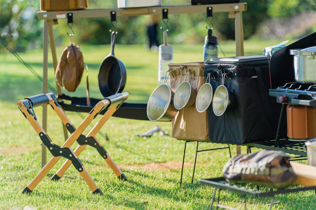 キャンプ用品であれば、棚に収めるスペースだけでなく、一時的に床に置ける余白があると、出し入れや片付けもしやすくなります。