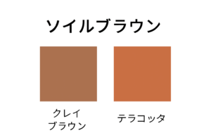 土の温もりを感じさせるブラウン系。クレイブラウンは落ち着いた重厚感を持ちつつ、柔らかい印象を与えます。テラコッタは赤みを帯びた温かい色味で、南欧風やナチュラルモダンなデザインに最適です。