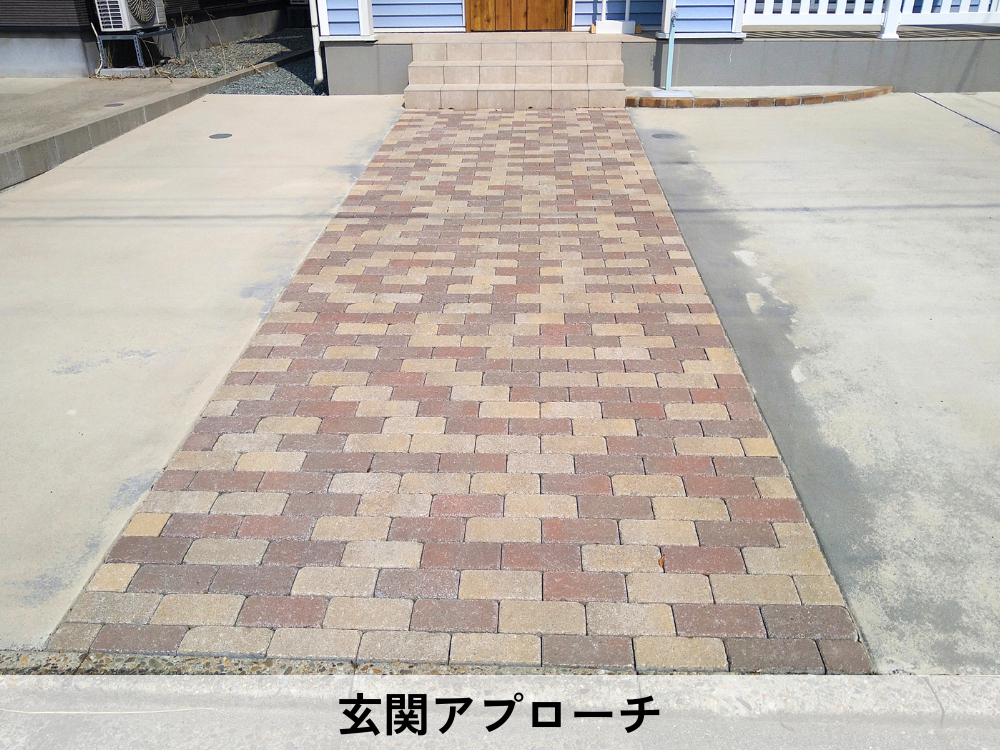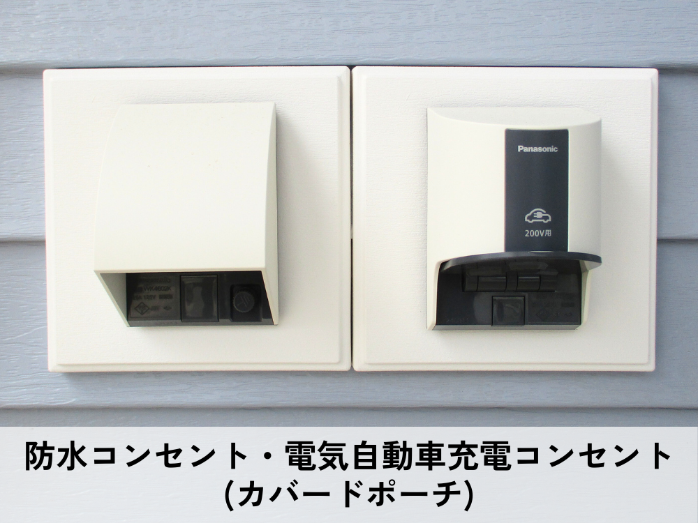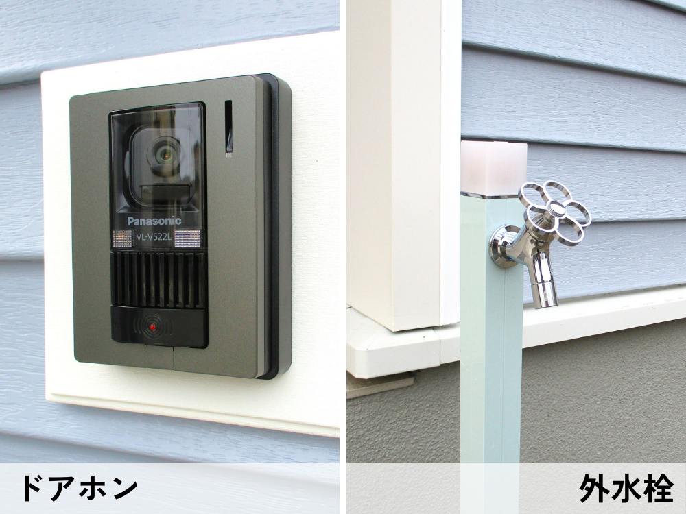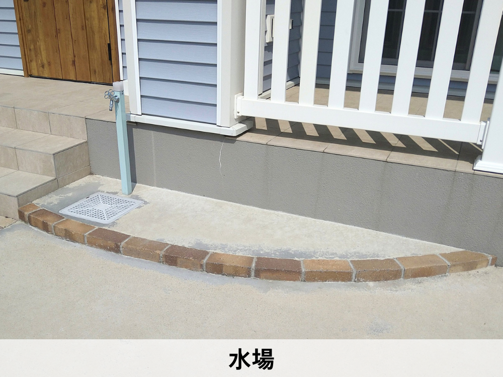 また、コンクリートに映えるレンガのアプローチと曲線で縁取られた水場があるこだわりの外構、かわいいデザインの外水栓や電気自動車用コンセントもポイント。