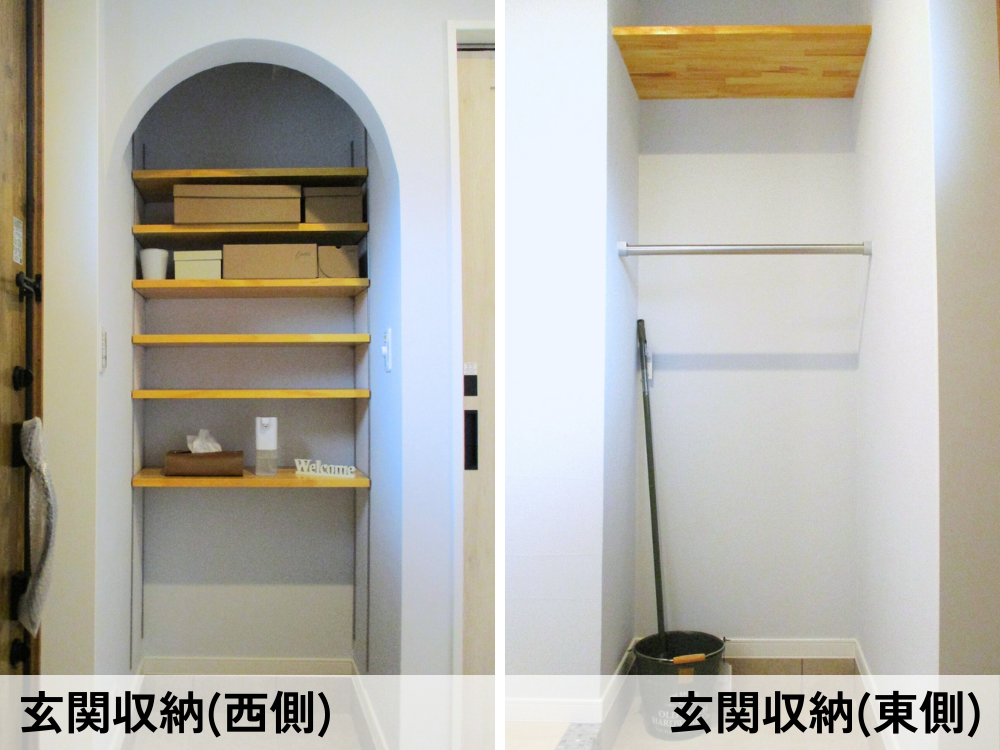 可動棚収納とコートが掛けられるパイプもあって、コンパクトで使い勝手の良い玄関です。