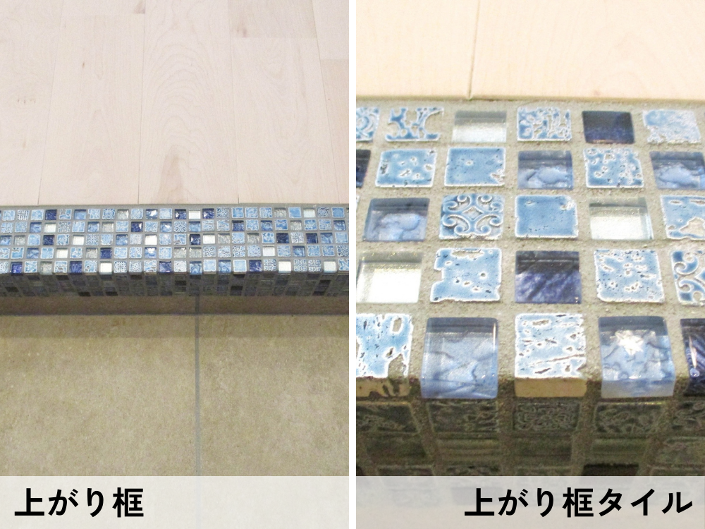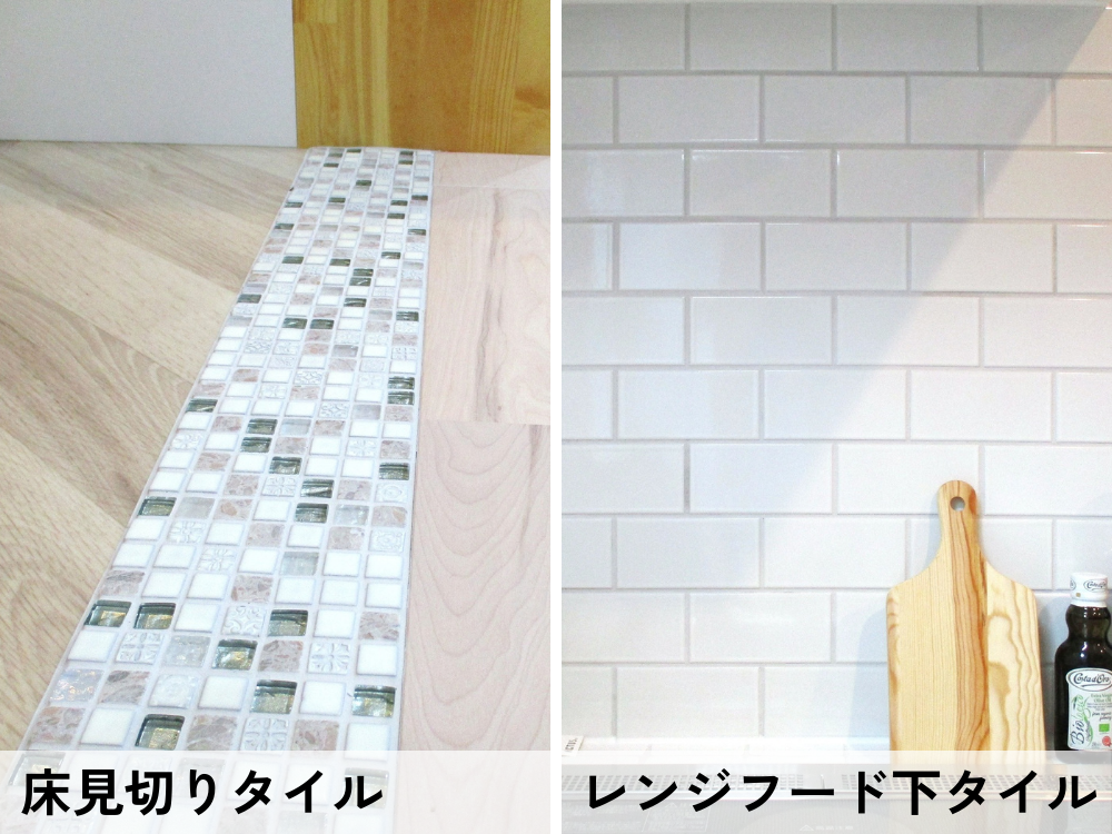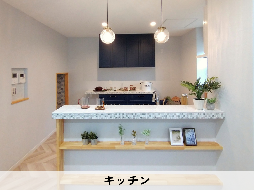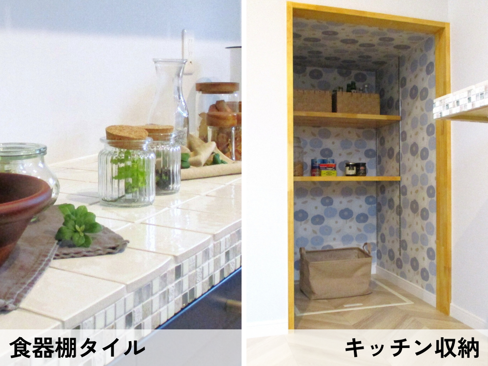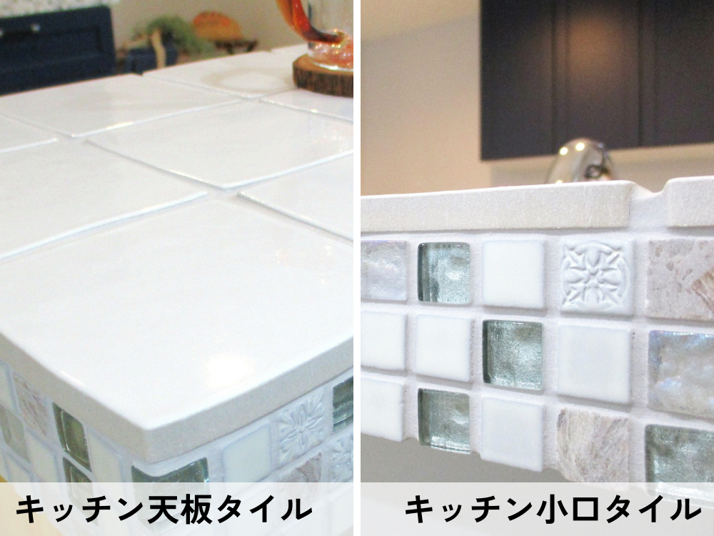 立ち上がりカウンター下の飾り棚や、床見切りとキッチンのタイル使いが凝ったつくりのオリジナルキッチン。