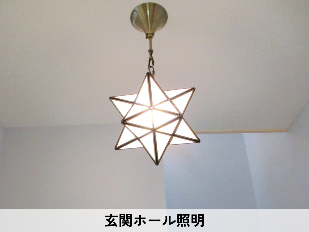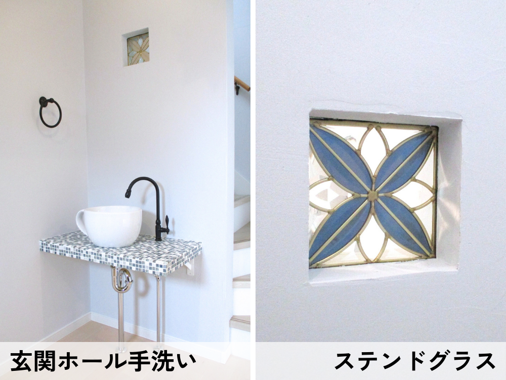 星型照明と青いタイルが美しい上がり框、コーヒーカップの手洗いとステンドグラス。