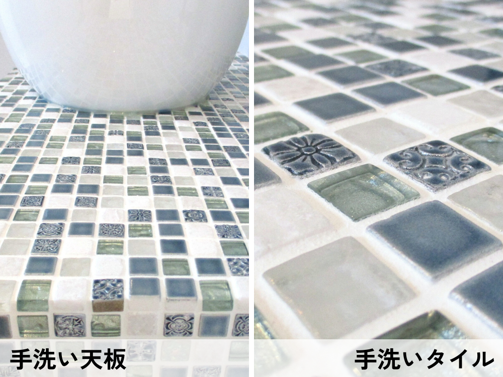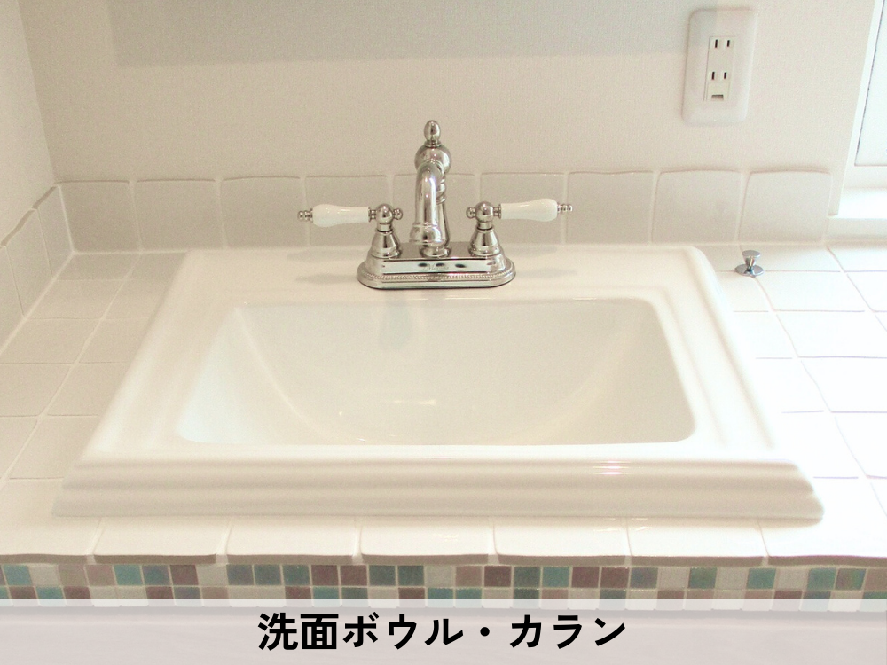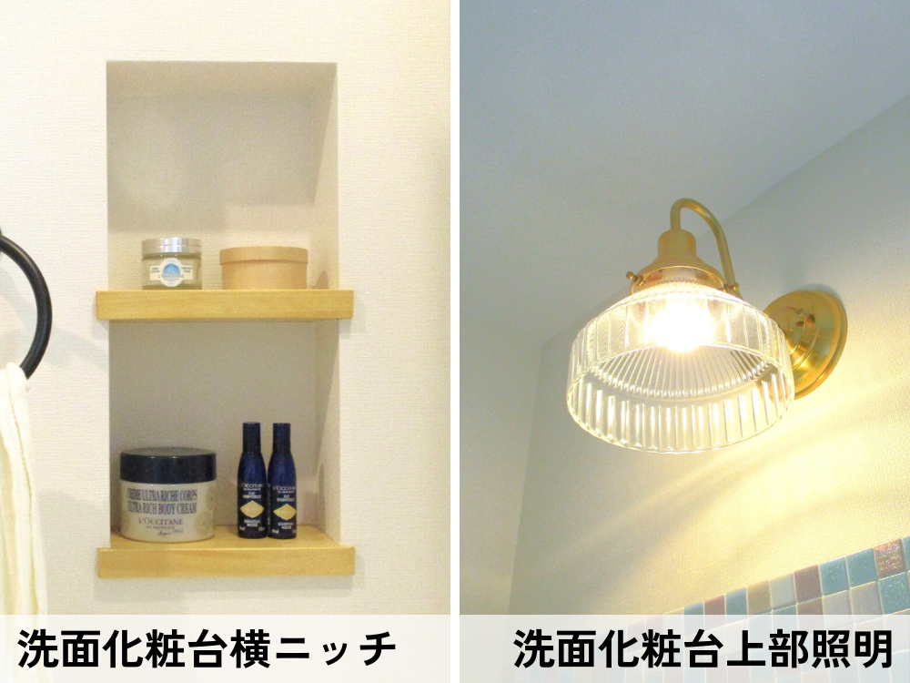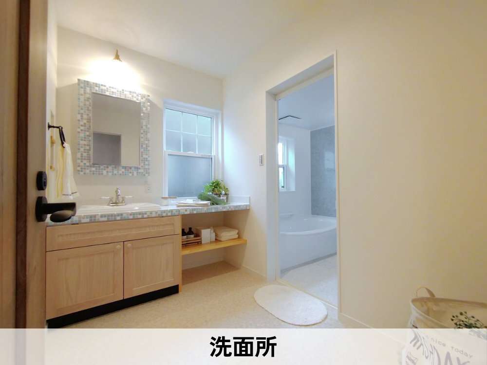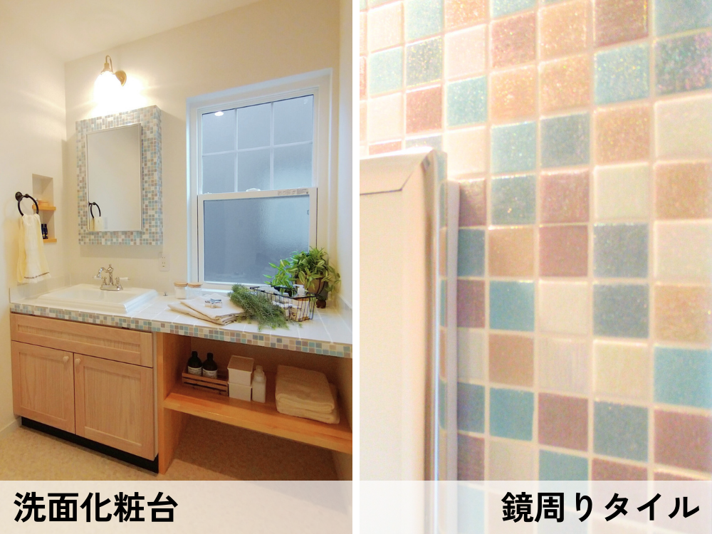 ゆったりとした洗面所は、きれいなタイルのオリジナル洗面化粧台が毎日のお出掛け準備の気分を上げてくれそう。