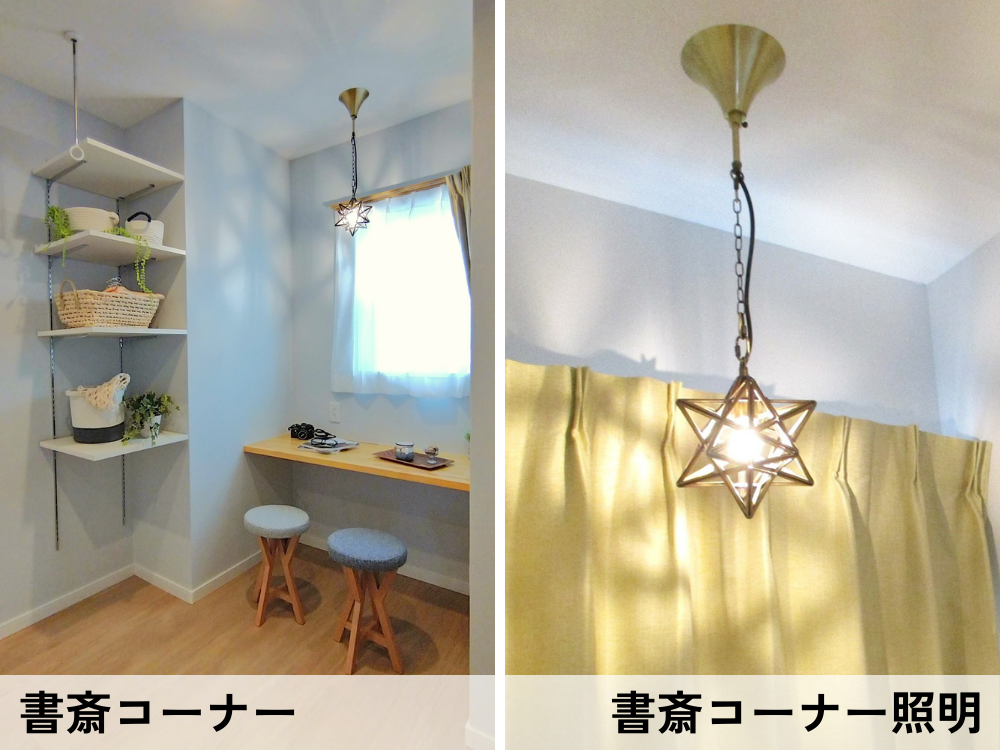 かわいい星型照明がある窓際の書斎コーナーは、書斎としても心地良く、アイロン掛けなど家事にも使える家族みんなの便利スペース。