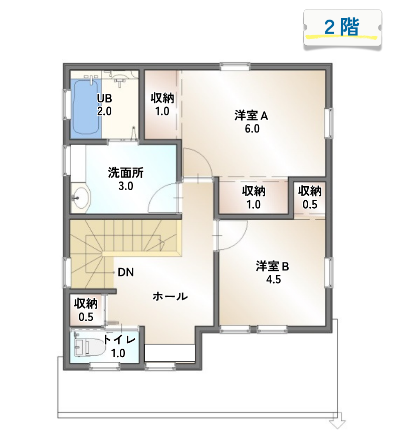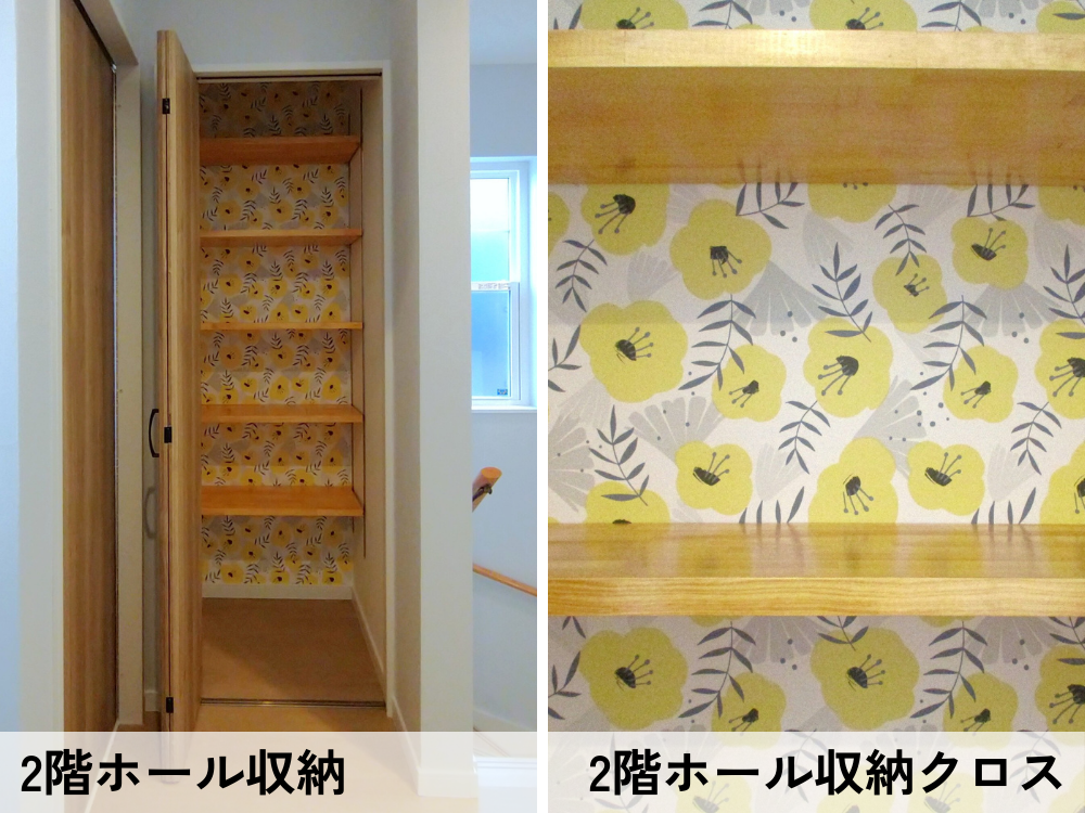 収納が付いた2階ホールは、黄色のアクセントカラーが目を引きます。
